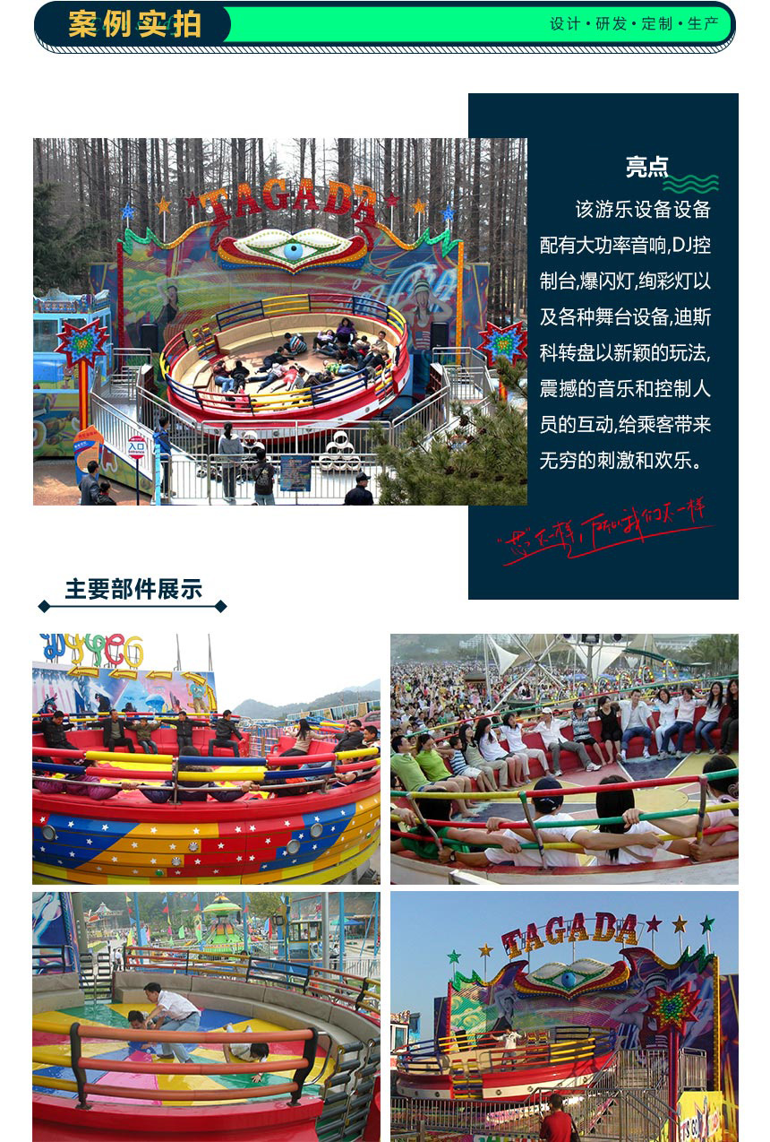 當(dāng)人坐在上面時(shí),并不是固定的!圓盤運(yùn)行時(shí)如大海波濤顛簸起伏,又如太空飛碟,變化無(wú)窮,時(shí)快時(shí)慢。迪斯科轉(zhuǎn)盤是陀螺類高速回轉(zhuǎn)大型游樂(lè)設(shè)備。游客乘坐的吊箱在強(qiáng)離心力作用下,高速旋轉(zhuǎn)翻飛,仿佛被推入超越時(shí)空的天體,翻江倒海、天旋地轉(zhuǎn),驚心動(dòng)魄的刺激,風(fēng)馳快感,令人回味無(wú)窮。
